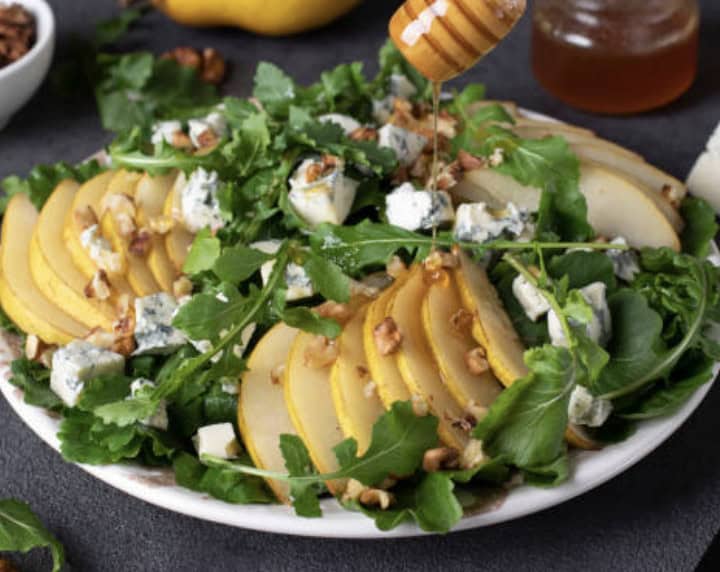 Arugula, Asian pear, toasted almonds, goat cheese, dried cranberry, housemade apricot Dijon dressing (honey, Dijon mustard, lemon juice, apricot jam, lemon juice, lemon zest, garlic, salt, pepper, oil).