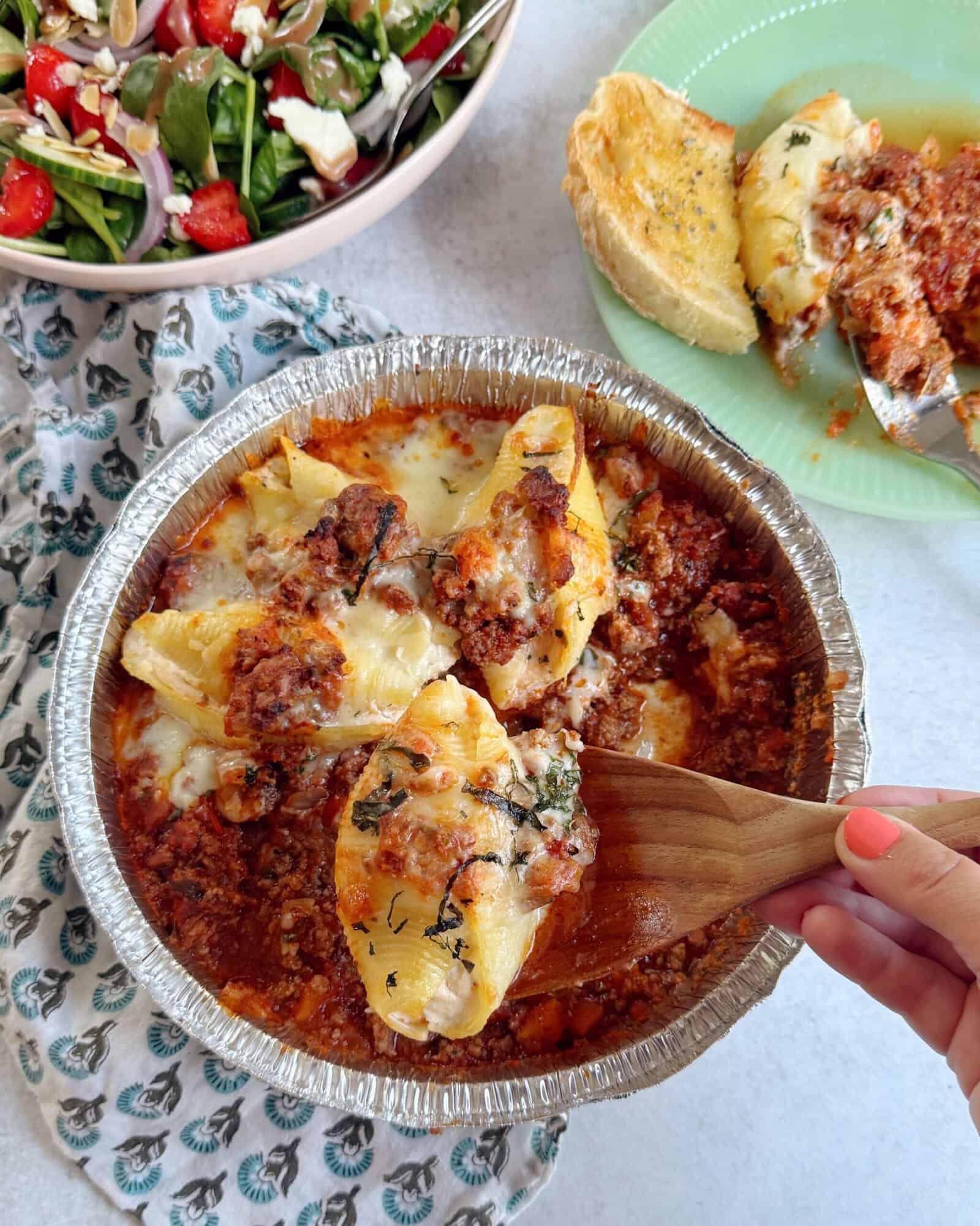 Jumbo shells filled with our housemade grass-fed beef bolognese filling, ricotta, mozzarella, and served with additional bolognese sauce. Serves 2.
