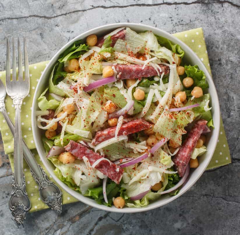Chopped lettuce, salami, provolone, parmesan, pepperoni, grape tomatoes, sliced pepperoncini, shaved red onion, fresh basil, housemade Italian Vinaigrette.
