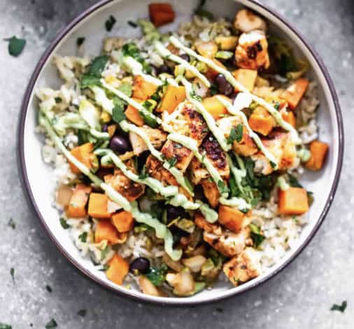 Chicken, roasted seasonal vegetables, brown rice, cashews, fresh basil, housemade basil vinaigrette.