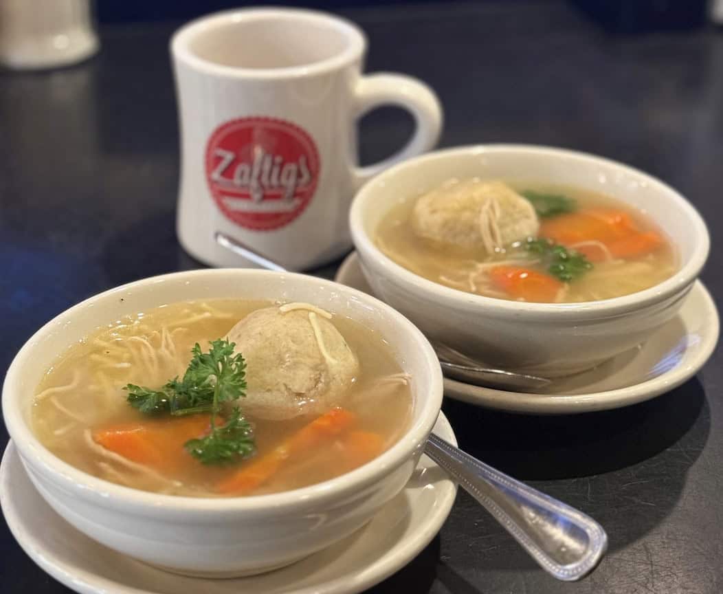 Made in-house at Zaftigs Brookline location. Serves 2. Matzo Balls & Noodles on the side.